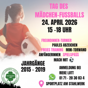 Am 24. April 2026 von 15:00 bis 18:00 Uhr laden wir alle fußballinteressierten Mädchen der Jahrgänge 2015 bis 2019 ein.